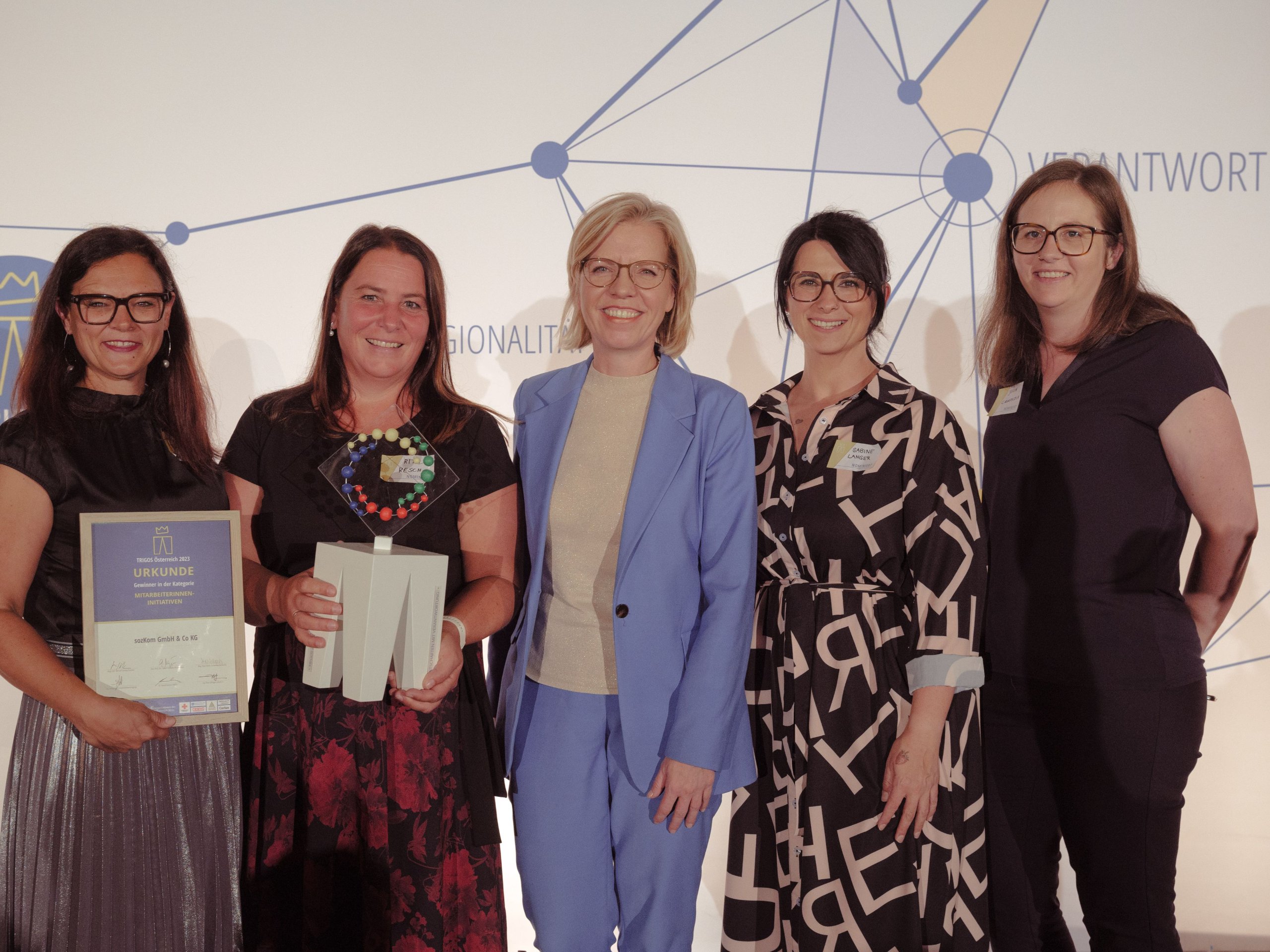 Sabine repräsentierte uns stolz auf der Bühne neben den beeindruckenden Mitbewerbern in dieser Kategorie – SONNENTOR und HappyFoto. Unter tosendem Applaus wurde sozKom als Gewinnerin in der Kategorie Mitarbeiter*innen-Initiative ausgerufen.